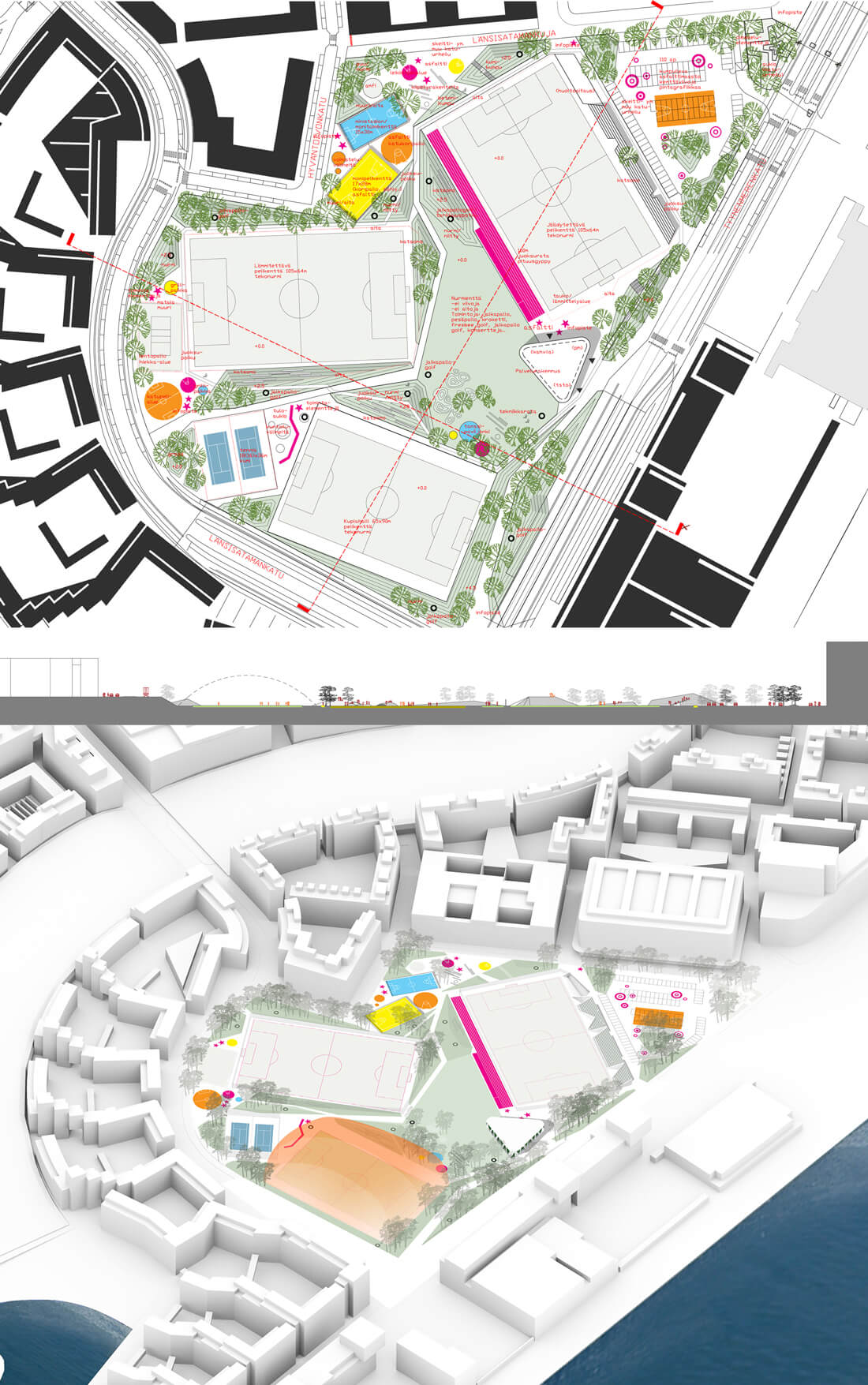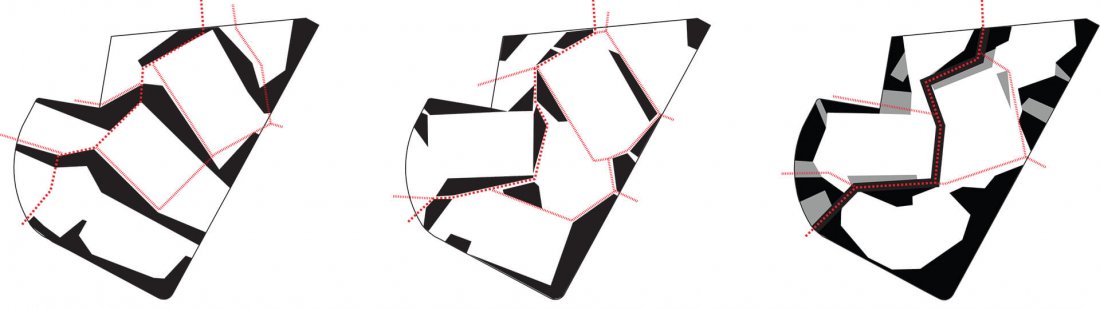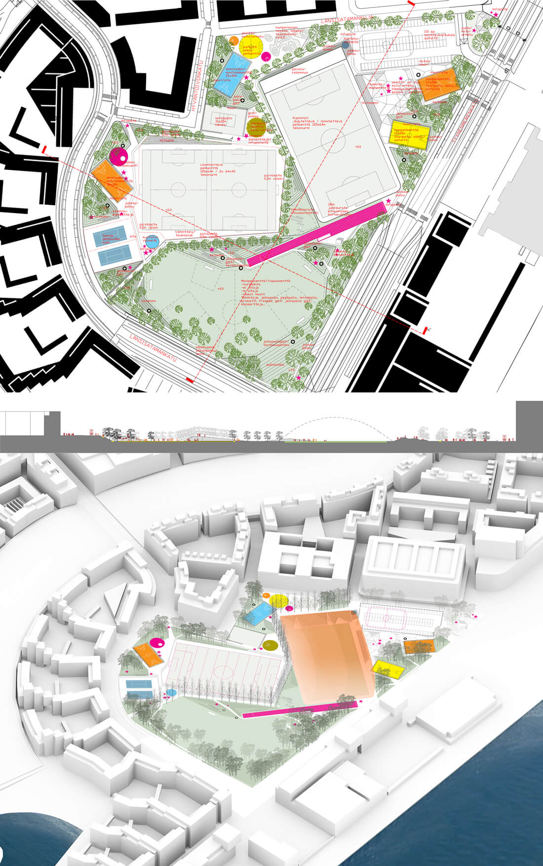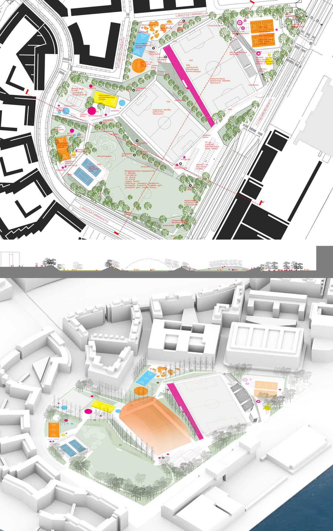 The plan comprises 3 suggestions for the new sports park, all proposing a re-use of the construction residue earth as hills/small ridges, to give rhythm and shelter to the different spaces of the park. The formation of the earth banks divide the park construction into phases, making it possible to begin the park already with the surrounding housing blocks, where the residue earth can be placed on to the planned site. This enables one park space to be built at a time.