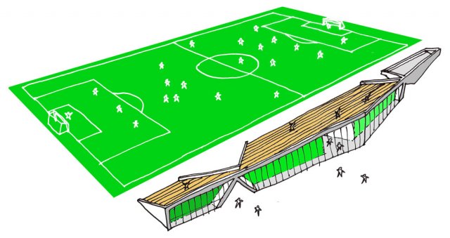 2 larger building volumes in connection to the spectators’ stands.