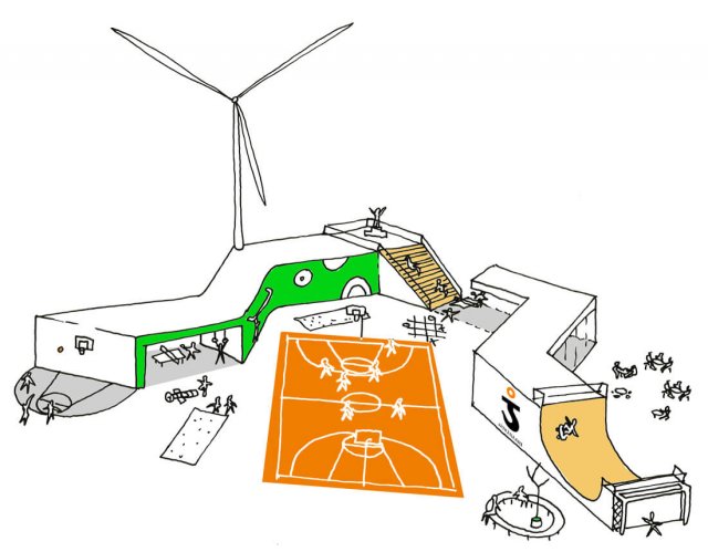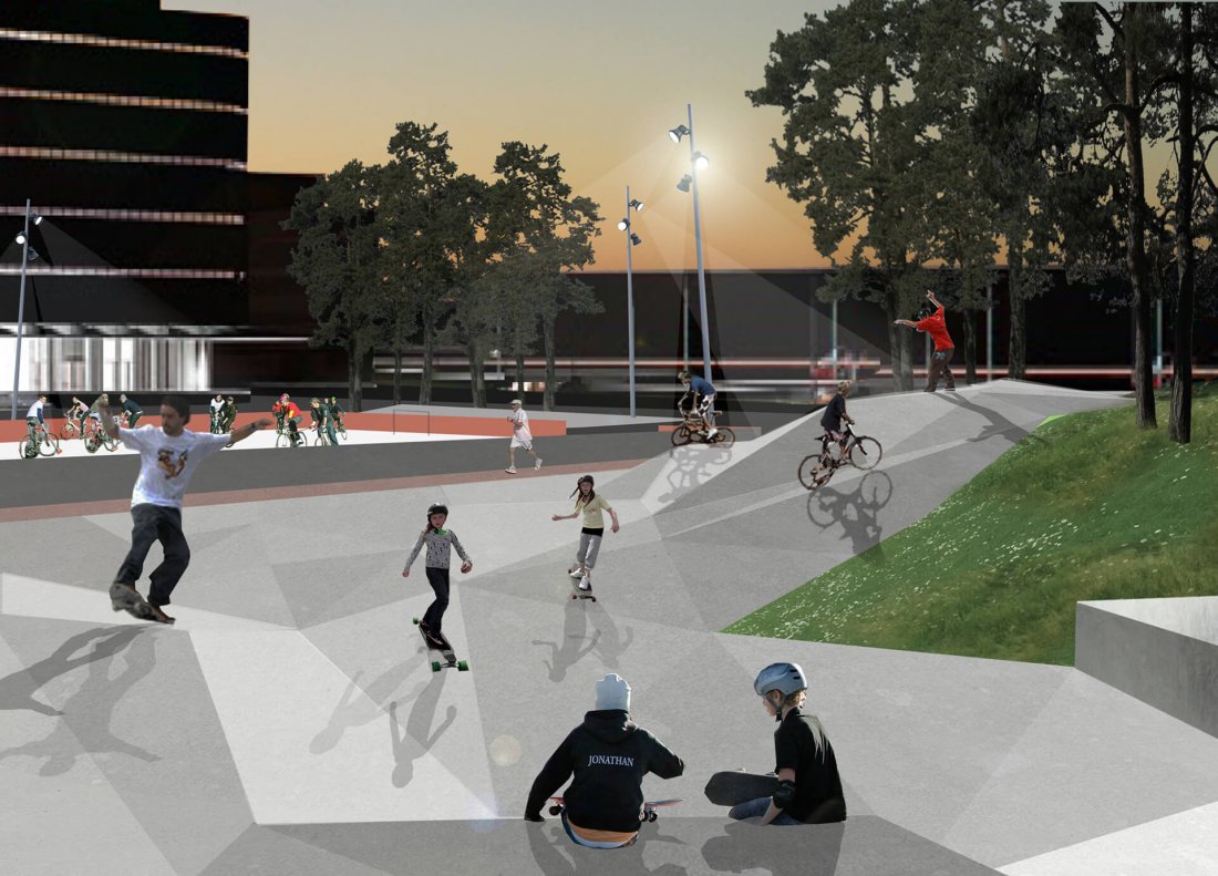 Larger game fields and parking areas are situated in the corners of the park, leaving room for an open, flexible and versatile gamefield/plane in the middle.